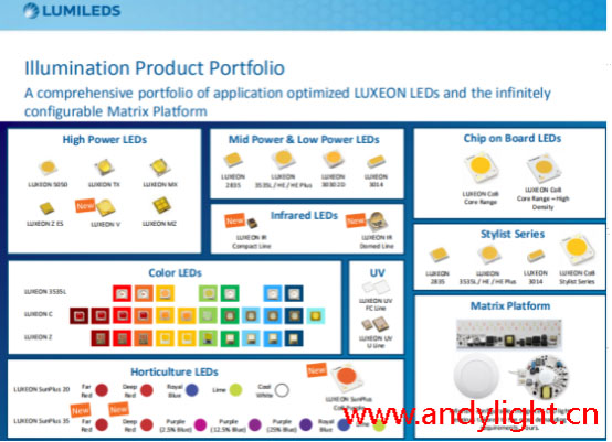 我們以飛利浦lumileds官方產(chǎn)品進行說明,看下圖從功率分可以高功率、中小功率、高壓、COB、模組等。從顏色分:紅外線波長為:大于800nm、紅色波長為;620~630nm;橙色波長為:600~620 nm;黃色波長為:585-600 nm;綠色波長為:555~585 nm;藍色波長為:440-480nm紫色波長為:350-440nm粉紅色波長:360-380nm紫外線:小于350nm(UV)。