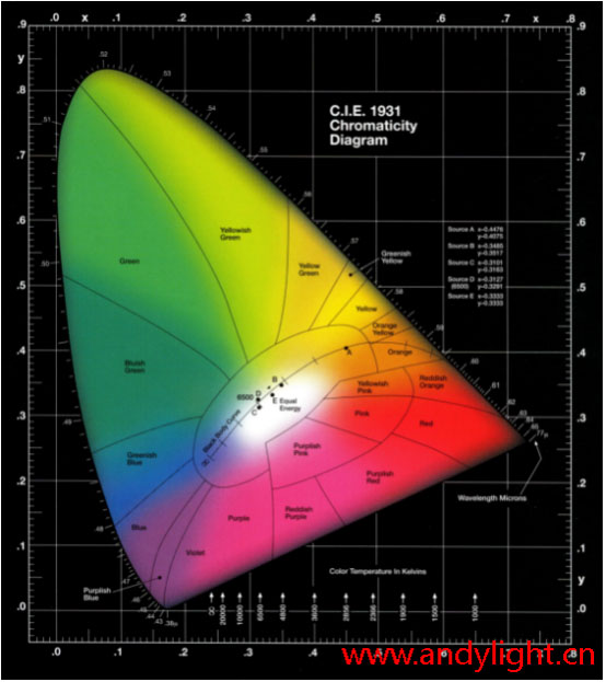 2. 做LED產(chǎn)品一定要會看色品圖,色品圖是以不同位置的點表示各種色品的平面圖。1931年由國際照明委員會(CIE)制定,故稱CIE色品圖,有人叫光譜圖也有色度圖反下叫化很多。