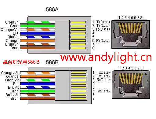 B、RJ-45水晶頭(網(wǎng)線):舞臺(tái)燈具應(yīng)國(guó)內(nèi)公共娛樂(lè)和文藝演出事業(yè)的蓬勃發(fā)展,特別是KTV行業(yè)的高速發(fā)展以前用卡儂頭焊接做信號(hào)線的方法成為了現(xiàn)場(chǎng)施工的難事,后來(lái)出現(xiàn)用水晶頭的方法來(lái)做舞臺(tái)燈光的信號(hào)聯(lián)接。需要說(shuō)明的是RJ-45水晶頭(網(wǎng)線)聯(lián)接并不是真的網(wǎng)絡(luò)協(xié)議,而是DMX512協(xié)議.RJ45 型網(wǎng)線插頭又稱(chēng)水晶頭,共有八芯做成,廣泛應(yīng)用于局域網(wǎng)和 ADSL 寬帶上網(wǎng)用戶(hù)的網(wǎng)絡(luò)設(shè)備間網(wǎng)線(稱(chēng)作五類(lèi)線或雙絞線)的連接。在具體應(yīng)用時(shí),RJ45 型插頭和網(wǎng)線有兩種連接方法(線序),分別稱(chēng)作 T568A 線序和 T568B 線序(下圖)舞臺(tái)燈光都是用T586B的接線方法,也就是一一對(duì)應(yīng)。